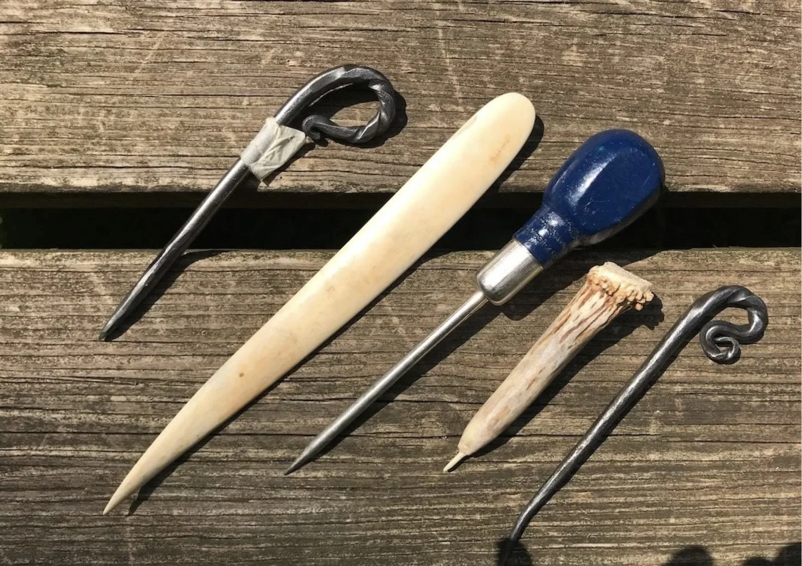 What a great tool! Basically a pointy piece of metal, there are a couple of different uses for an awl. They are used for poking holes, opening up weaving spaces, finishing rims, and a ton of other random tasks. I have two awls: a sharp, narrow one for poking holes and a wider, less sharp one for opening spaces. For beginning basket makers one is fine. I have a blacksmith who makes a specific awl for my classes that work well for both purposes. ( If you are interested in ordering one reach out to me). Bone awls are also great for many purposes.